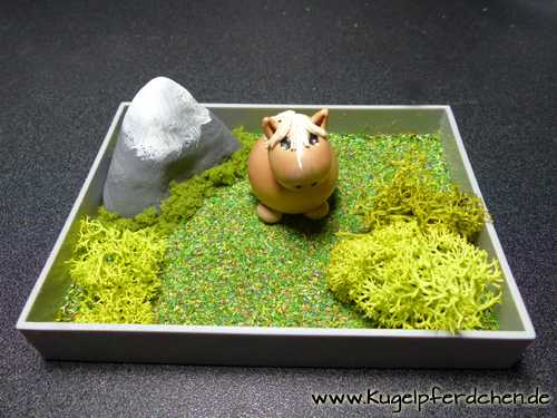 Das Kugelpferdchen wird lose in die Box gestellt, kann auf Wunsch jedoch auch fest verklebt werden. Allerdings wird dann der "Original Kugelpferdchen"-Stempel, der das Kugelpferdchen als echt kennzeichnet, verdeckt.