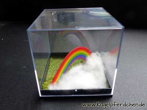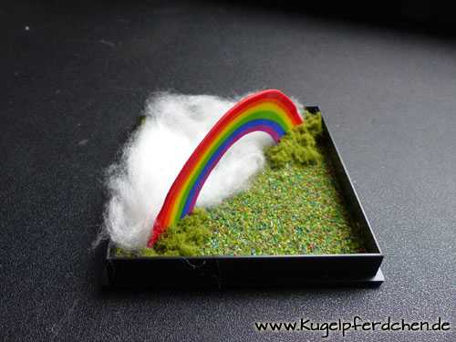 Dekobox mit Kunstgras und einem Regenbogen in der Mitte. Die eine Seite ist für den Freund, der schon gehen musste. Er steht auf einer flauschigen Wolke, vom Diesseits getrennt durch den Regenbogen. Auf der anderen Seite Gras und hier findet sein Kumpel, der noch auf Erden wandelt, sein Plätzchen.