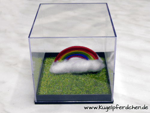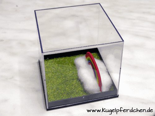 Dekobox mit Kunstgras, einem Regenbogen im Hintergrund und weißer, wuscheliger Wolke. Eine schöne Erinnerung an einen verlorenen Freund oder einfach nur eine schöne Stimmung über der Weide...