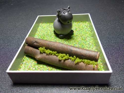 Das Kugelpferdchen wird lose in die Box gestellt, kann auf Wunsch jedoch auch fest verklebt werden. Allerdings wird dann der "Original Kugelpferdchen"-Stempel, der das Kugelpferdchen als echt kennzeichnet, verdeckt.