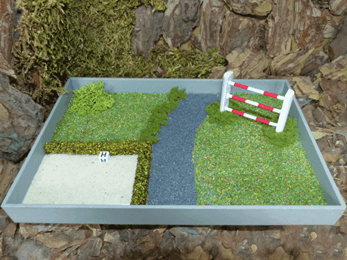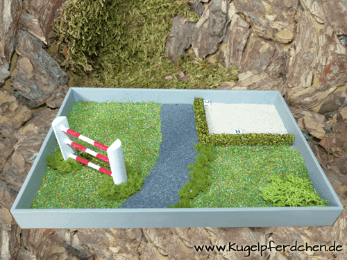 Diese Box ist das Richtige für die Multitalente unter den Kugelpferdchen. Wer mit seinem Pferd in allen Disziplinen zuhause ist, dessen Kugelpferdchen fühlt sich in dieser Box am wohlsten. Sie hat einen Ausschnitt eines Dressurplatzes (natürlich mit Buchstaben), einen Sprung, eine Koppel und einen Reitweg. So kann das Kugelpferdchen immer da stehen wo es gerade will...