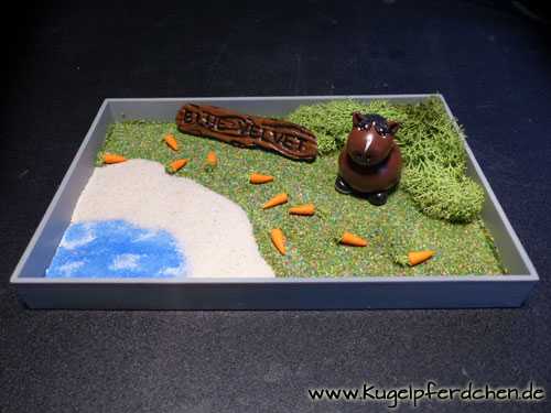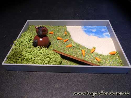 Diese Dekobox hat eine Weide mit Gebüsch und in einer Ecke einen Sandstrand mit Meer. Da kann das Kugelpferdchen auch mal am Strand entlang rollen... :-)