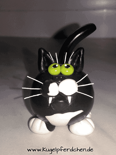 Die Flecken und Zeichnungen der Katze werden so genau wie möglich abgebildet. Aber die Kugelpferdchen oder hier die Kugelkatzen sind kleine Kunstwerke, keine 3D-Fotos. Insofern gibt es vor allem bei Schecken, Fliegenschimmel und co Abweichungen vom Original (schon alleine, weil so eine Kugelkatze ja auch keinen Hals hat). Bisher hat allerdings noch jeder sein Tier sofort wieder erkannt. Erwähnt sei das nur für die ganz genauen, falls doch mal jemand dabei ist, der mit dem Foto in der Hand über dem Kugelpferdchen sitzt und Pünktchen und Flecken zählt ;)