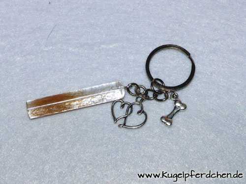 Der Schlüsselanhänger bekommt oben eine Kette mit Ring und dazu ein Metall-Charm als Anhänger. Je nachdem, was zum Haar passt z.b. ein Hufeisen oder einen Knochen oder eben Herzchen oder vierblättriges Kleeblatt. Bitte schreib mir in die Kommentare, welcher Anhänger Dir gefällt (siehe Foto)