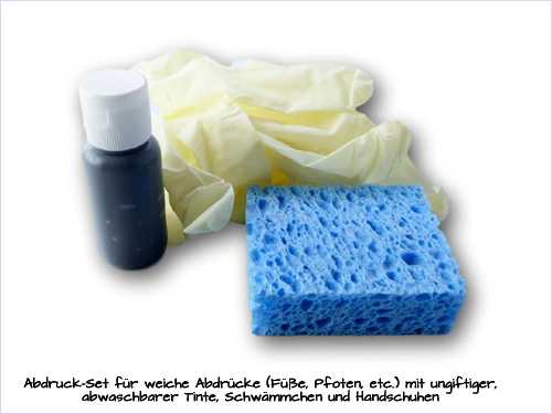 - Du erhältst ein Set, mit dem Du den Abdruck Deines Tieres nehmen kannst (bestehend aus einem Fläschchen mit Farbe (ungiftig und leicht abwaschbar), einem Schwamm , einer Anleitung und einem Paar Handschuhe (latexfrei).