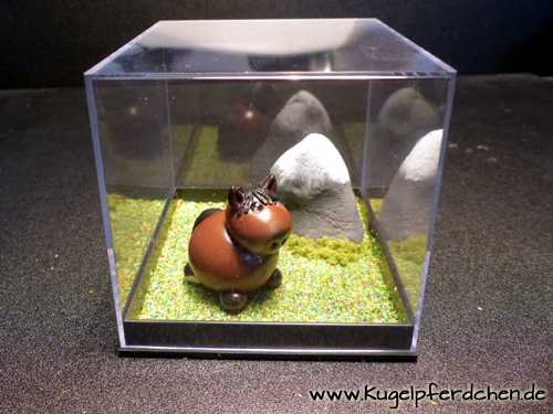 Das Kugelpferdchen wird lose in die Box gestellt, kann auf Wunsch jedoch auch fest verklebt werden. Allerdings wird dann der "Original Kugelpferdchen"-Stempel, der das Kugelpferdchen als echt kennzeichnet, verdeckt.