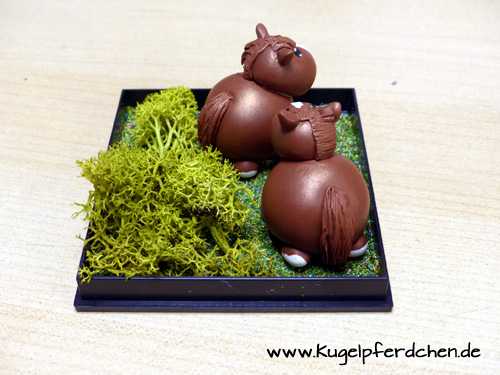 Hergestellt werden die kleinen Kugelpferdchen aus einem Material namens Polymer Clay, besser bekannt unter dem Markennamen Fimo®. Nach dem Aushärten ist das Kugelpferdchen hart und stabil und steckt einiges weg. Trotzdem sind Kugelpferdchen kein Spielzeug sondern zum Aufstellen und Anschauen gedacht.