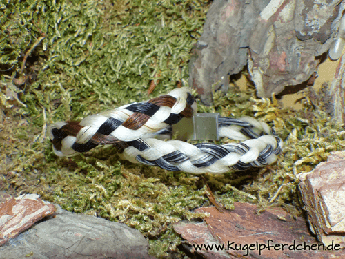 Ein Traum aus Pferdehaar: Pferdehaar-Armband mit vierfachem Flechtmuster, geflochten aus dem Haar Deines Pferdes oder Deiner Pferde. Das Armband hat einen matt gebürsteten Edelstahl-Verschluss (selbstverständlich nickelfrei) mit Magnetsicherung. So sitzt das Armband sicher an Deinem Arm.