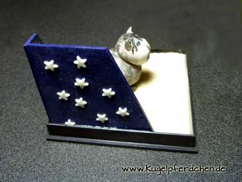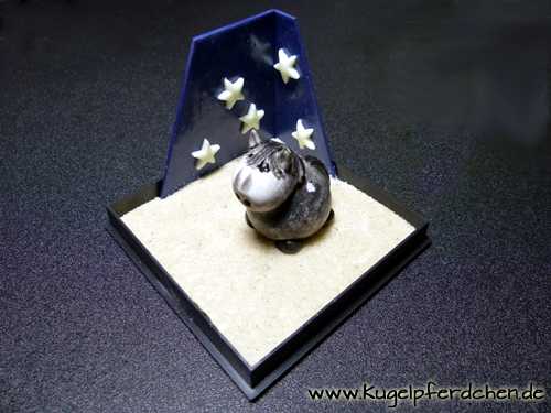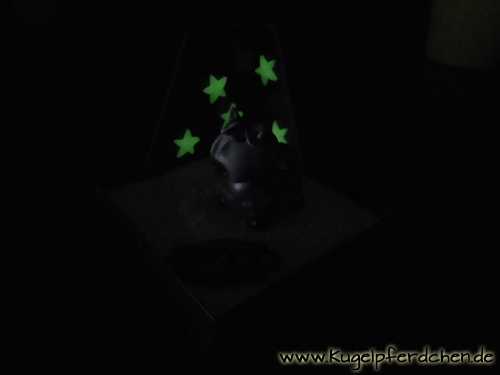 Die Box ist einem Nachthimmel nachempfunden und sowohl außen als auch innen mit kleinen Sternen versehen. Die Sterne speichern tagsüber Licht (auch Kunstlicht, muss also nicht in der Sonne stehen) und glimmen nachts. In der Box steht das Kugelpferdchen auf Sandboden. Ein wunderschönes Kleinod für den Nachttisch oder auch sonst überall, wo es auch mal dunkel wird und man sich an dem magischen Glimmen der Sterne erfreuen kann.