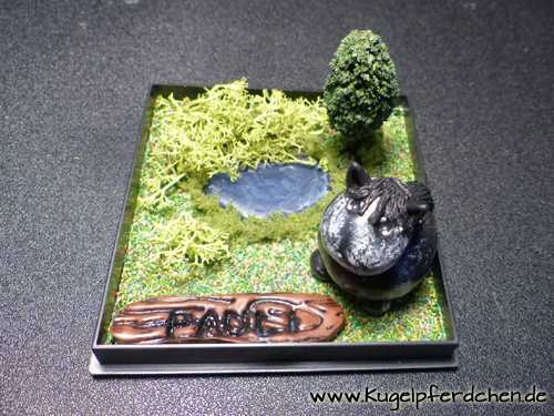 Ein schöner kleiner Teich, versteckt zwischen Gebüsch und ein schattiges Plätzchen unterm Baum - was will das Kugelpferdchen mehr... Im Beispielbild mit Namensschild in Holz-Optik (das findet Ihr in der Rubrik Zubehör)
