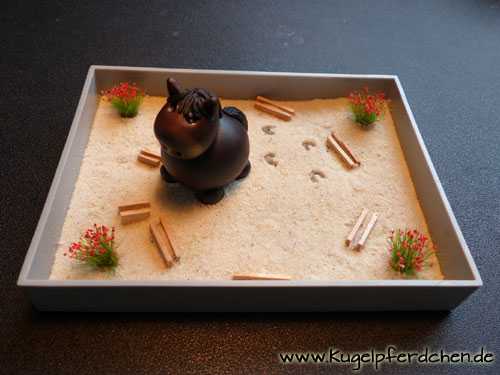 Das ist die Box für die Voltigierer unter Euch. Ein mit kleinen Holzstückchen abgesteckter Volti-Zirkel, in der Ecke kleine Blumen zur Auflockerung, als Boden schöner, heller Sand. Da fühlt sich das Voltigier-Kugelpferdchen zuhause.